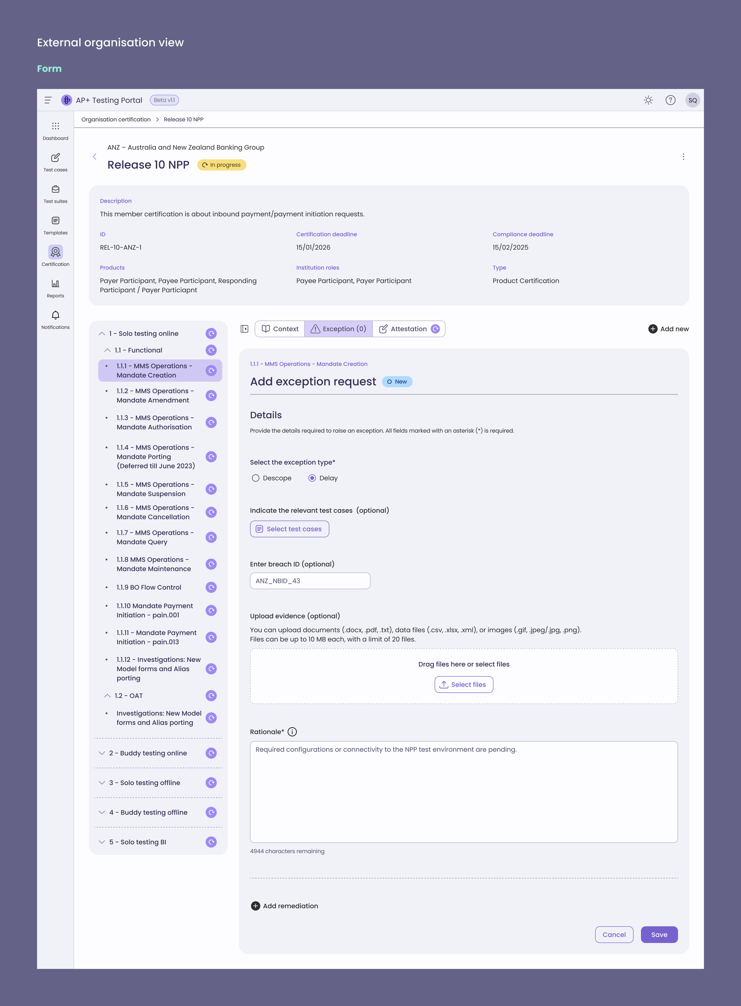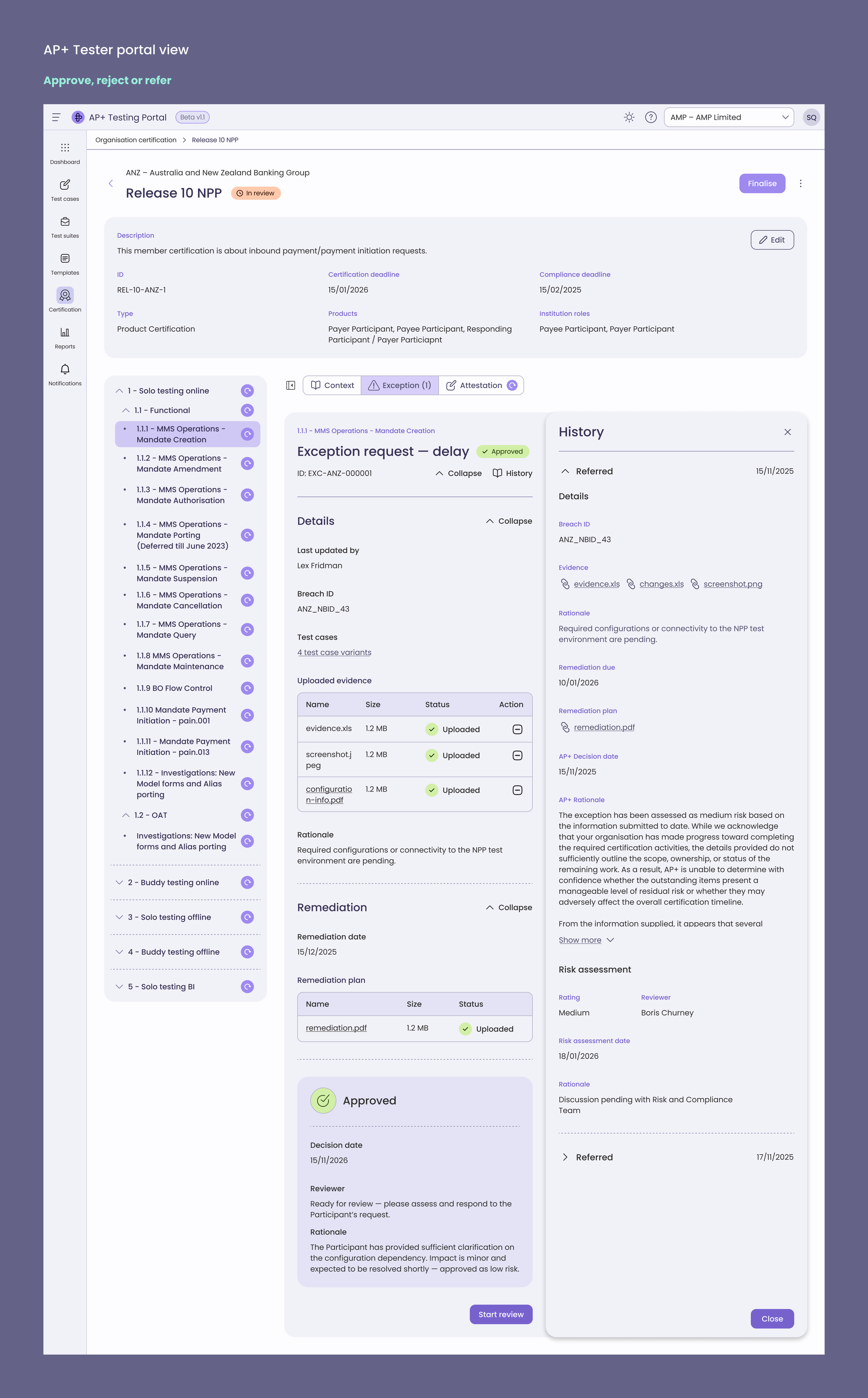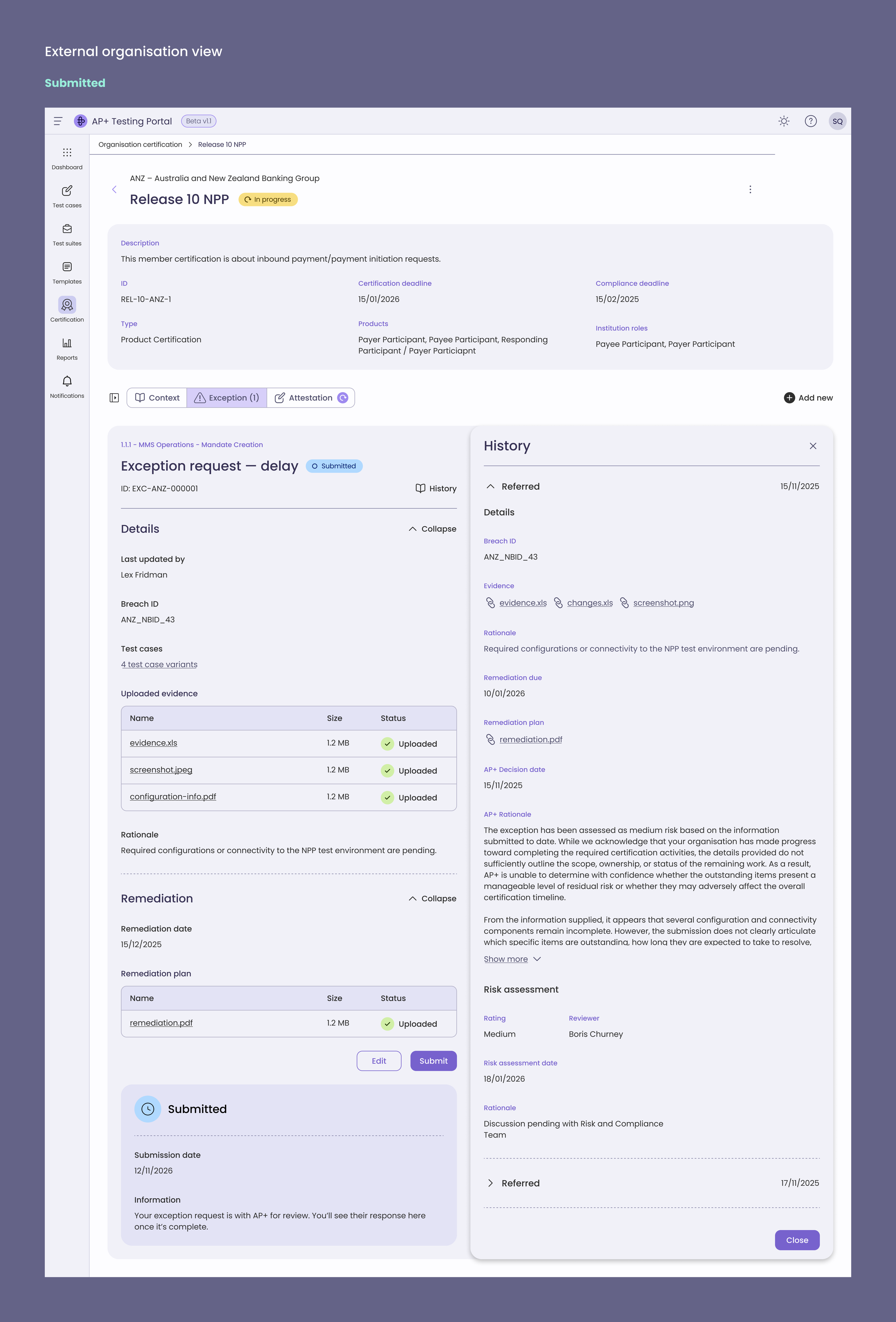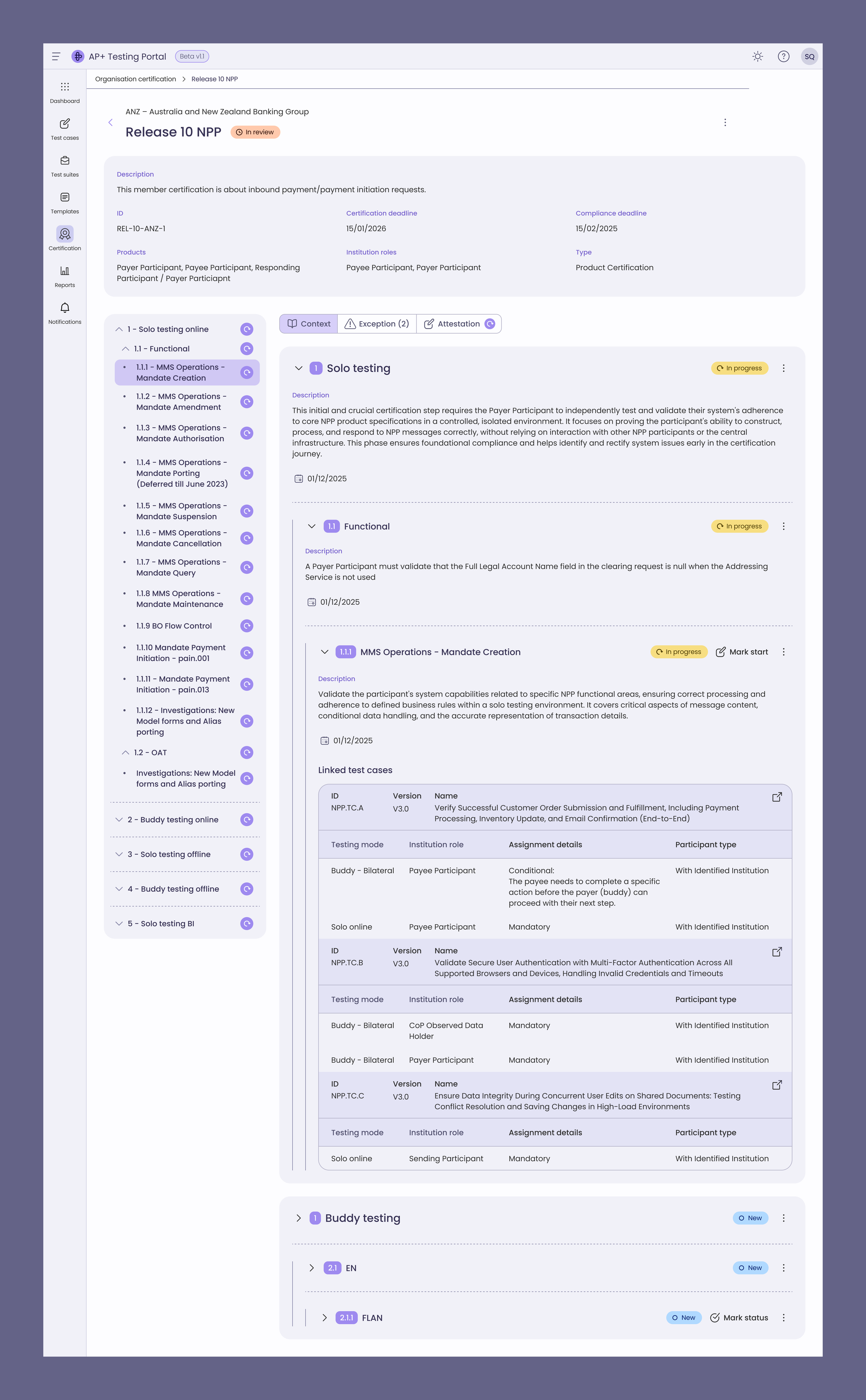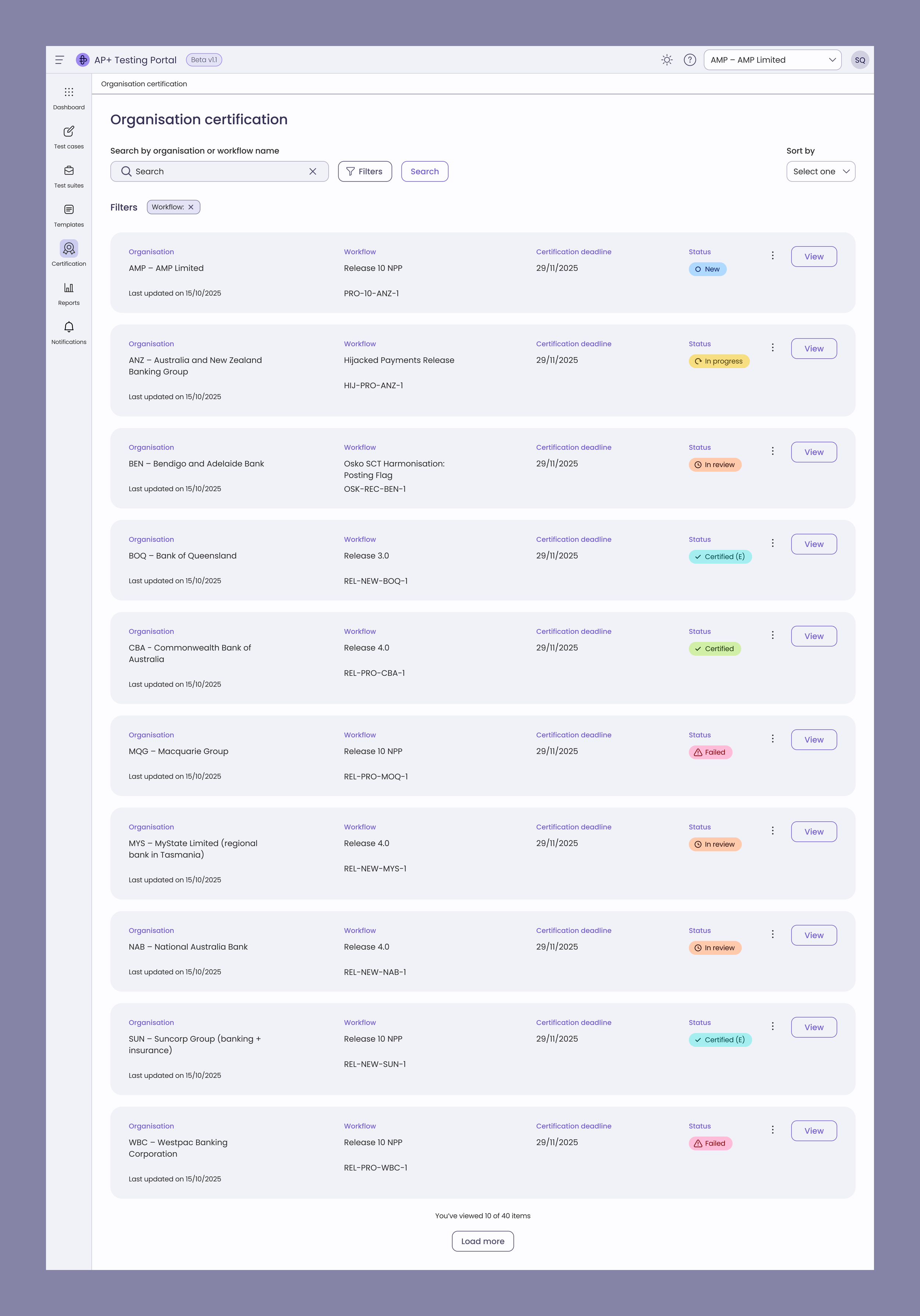 The AP+ Testing Portal at Australian Payments Plus is a non-mobile first web application built to replace manual, spreadsheet-heavy certification workflows.