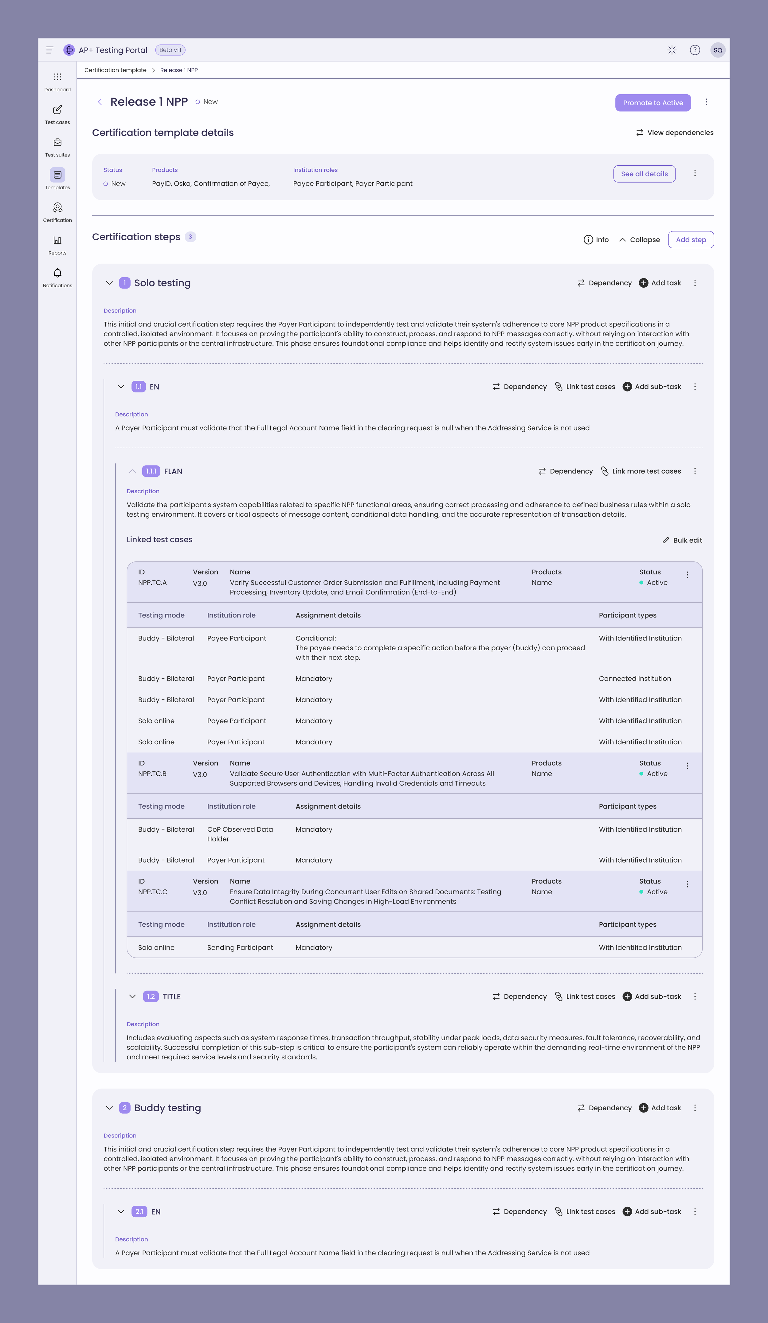 It displays required steps, linked test cases, statuses, and dependencies in one place, guiding Participants through what to do next and enabling them to progress confidently with transparency and consistency.