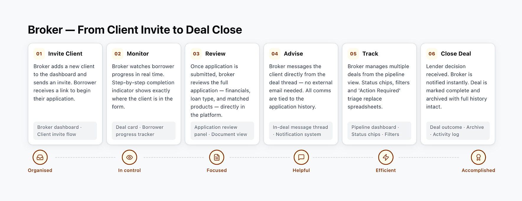 Broker efficiency — brokers can track and manage multiple deals without needing to chase status updates