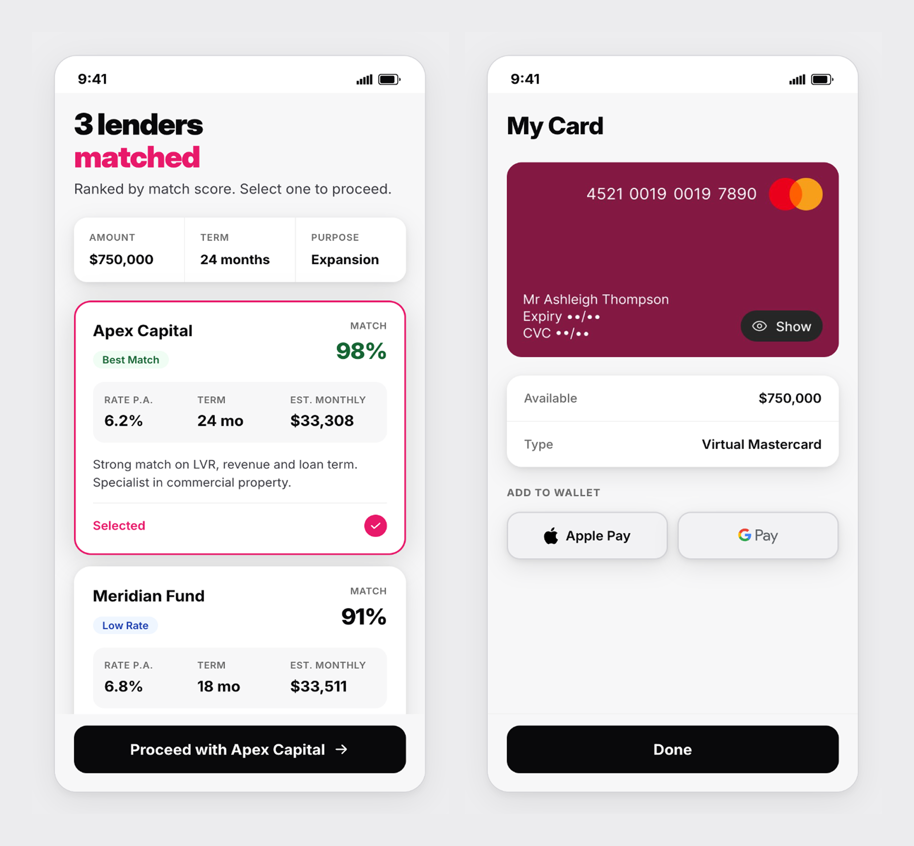 Each card shows rate, term and match score so borrowers can self-validate