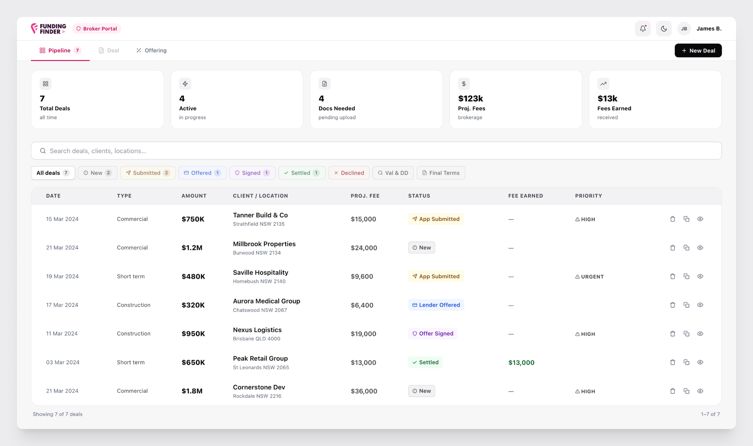 Deal table designed for speed — application stage, amount, fee and priority