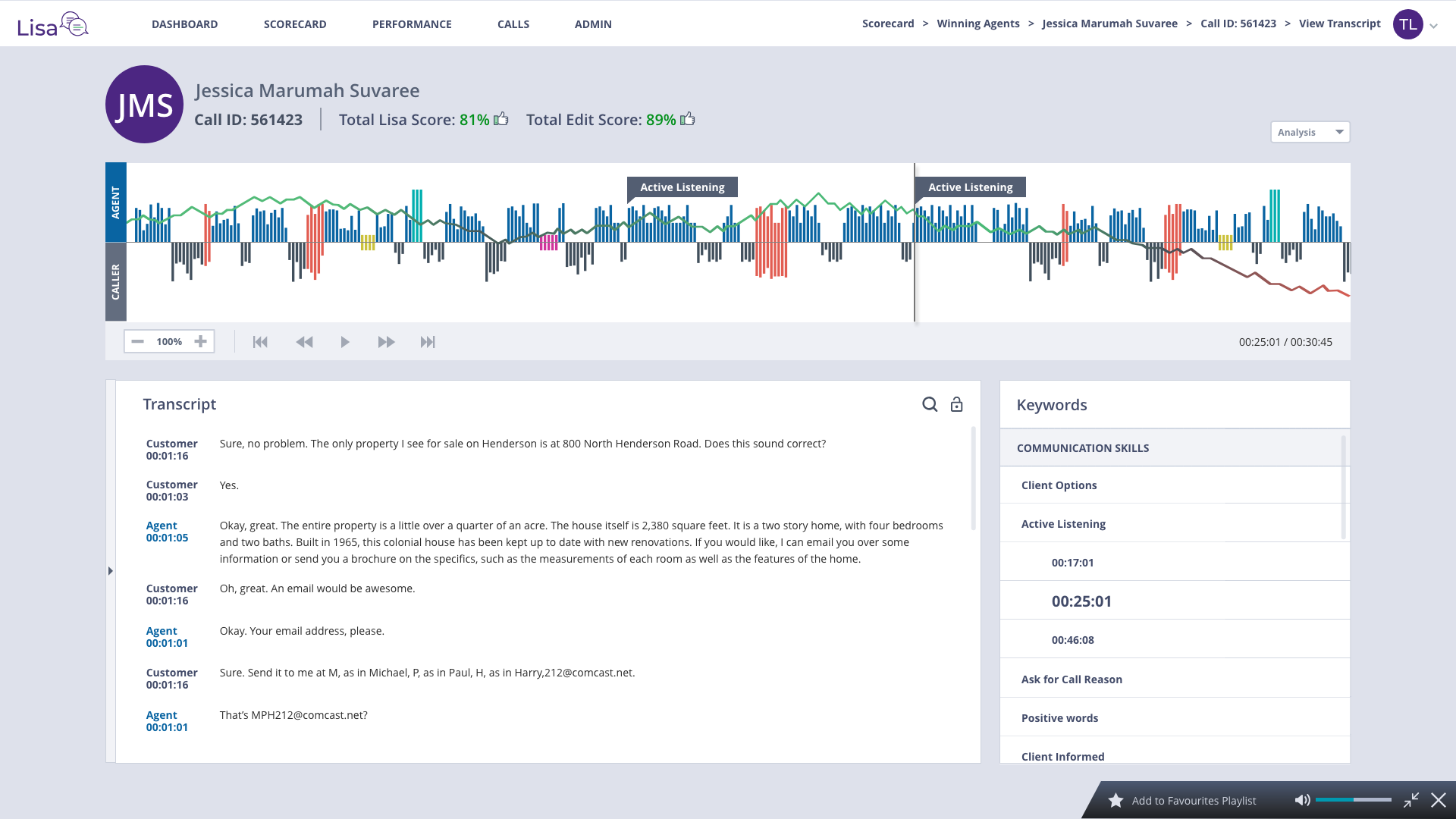 Thomas is able to look maximise the audio player to the transcription screen that shows him the detailed analysis of each call with transcription and indicates sections that have to do with Call Agents’ interruptions, overtalk, pauses, silences and sentiment. Thomas sees a set of keywords on the bottom right of the screen and is able to select key performance indicators such as “Active Listening” to go to the relevant sections that he could listen to where the call agent had demonstrated “Active Listening” in her call with the customer. Thomas uses this analysis for discussions with the agents in his team during calibration training sessions and performance reviews with individuals.