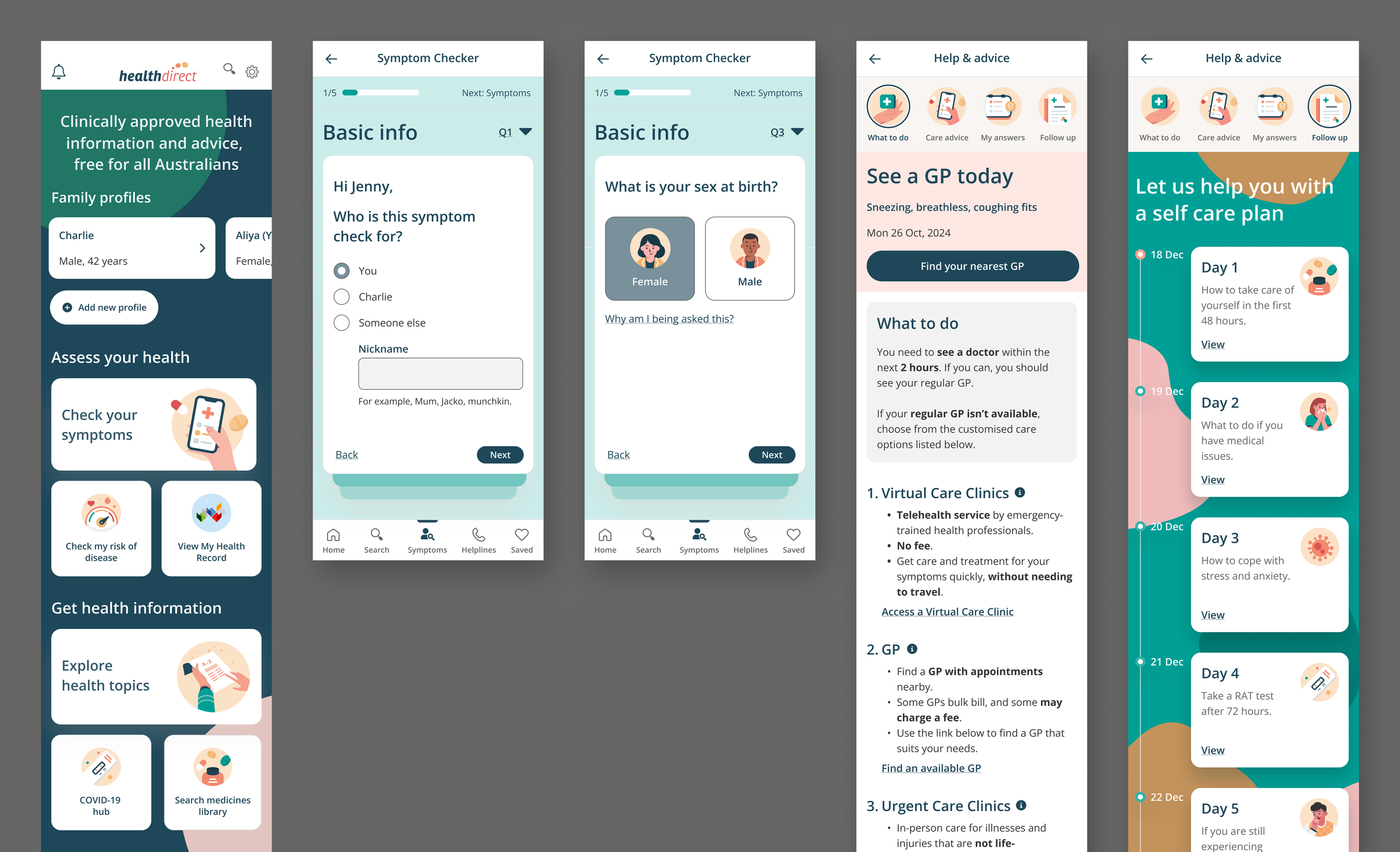 The Symptom Checker was prototyped for Healthdirect's mobile native app as a future build, featuring an additional "Follow-up Care Plan" — a guided experience that helps users manage their symptoms at home.