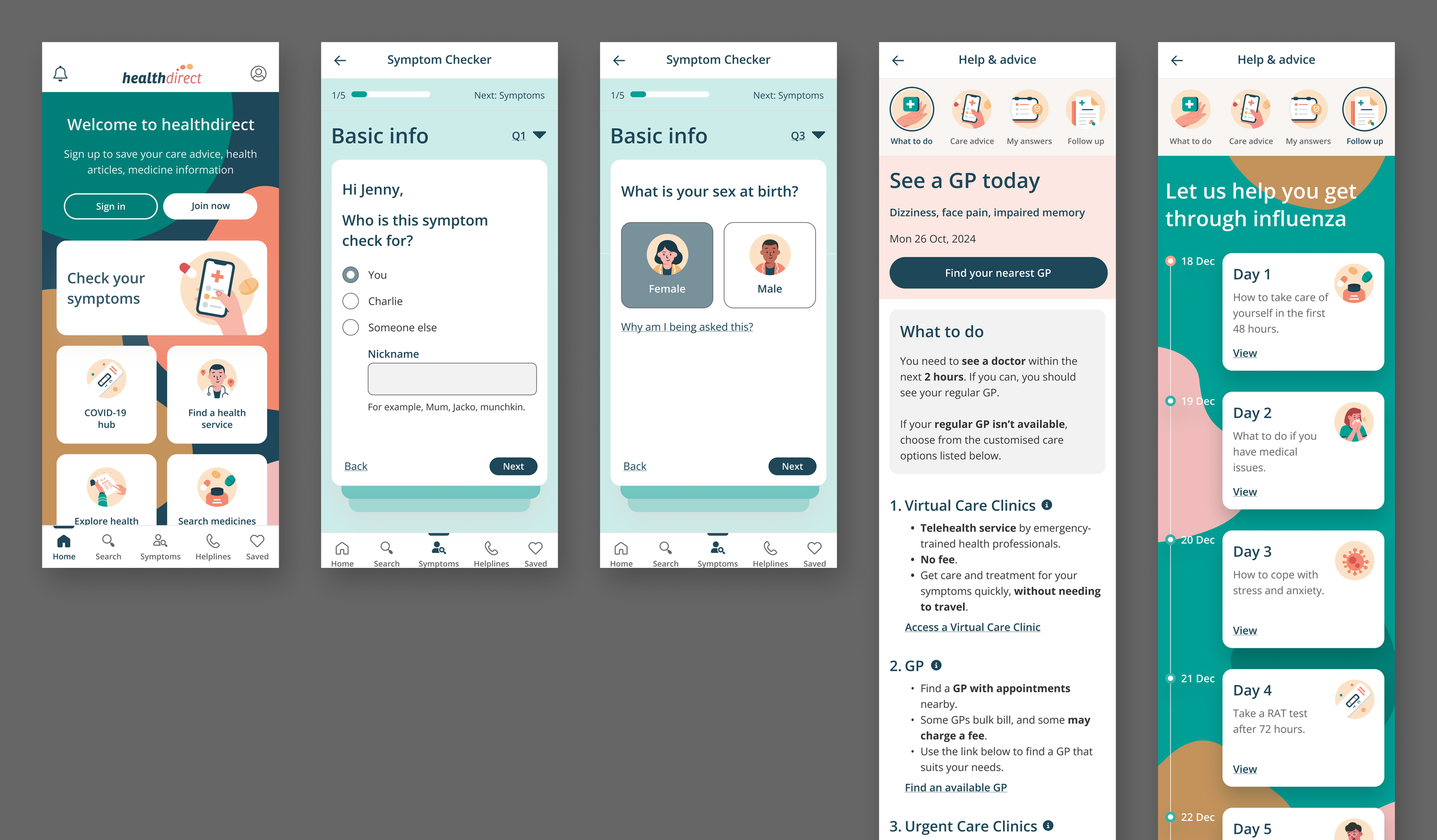The challenge was to redesign the experience around a new AI triage engine (Infermedica) while navigating Australia's strict clinical standards, legal constraints, and Healthdirect's non-diagnostic role.